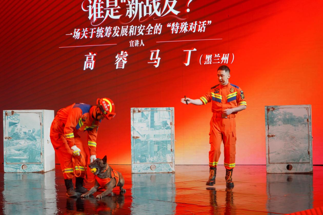 作品緊扣黨的二十屆四中全會精神,創新性地將國際視角融入理論宣講:馬丁以剛果(布)消防志愿者的身份,結合在中國的留學時光與志愿服務經歷,與主講人展開跨越國界的深度交流。作為中外文化交流的積極參與者和生動踐行者,馬丁在此次宣講中絕非簡單的助演嘉賓,而是以關鍵“對話者”的身份,綻放出獨特的跨文化魅力,他從國際友人的立場出發,表達了對中國“人民至上、生命至上”理念的深刻認同,分享了對中國特色大國應急管理體系的鮮活觀察,更從“人類命運共同體”的高度,闡釋了安全治理文化國際交流的深遠意義。這份兼具國際視野與人文溫度的表達,讓宏大的理論變得鮮活可感,生動印證了“統籌發展與安全”的中國智慧不僅屬于中國,更能為世界提供借鑒,也讓文明互鑒的種子在宣講現場生根發芽。