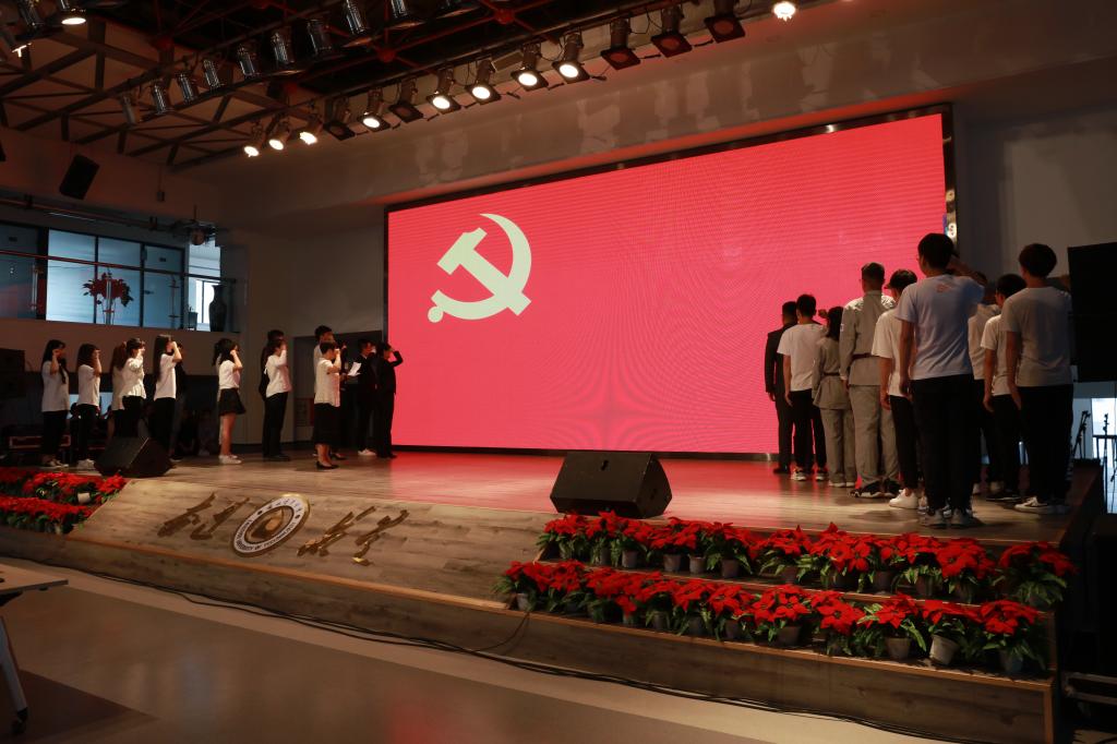 隨著熟悉的《義勇軍進行曲》旋律響起,在場所有人認真莊嚴地面向鮮紅的國旗,自豪地唱起國歌。隨后,新黨員進行入黨宣誓,老黨員重溫入黨誓詞。