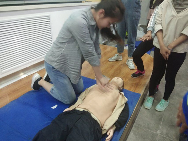 講座期間,培訓教官利用“模擬人”實施心肺復蘇操作演示,介紹心肺復蘇的操作步驟,包括判斷呼吸和意識、呼救、調整病人體位、胸外按壓、開放氣道、人工呼吸等方面的知識,并就操作過程中的注意事項進行示范。在活動接近尾聲時,救援隊安排每個班相應人員進行實踐演練。