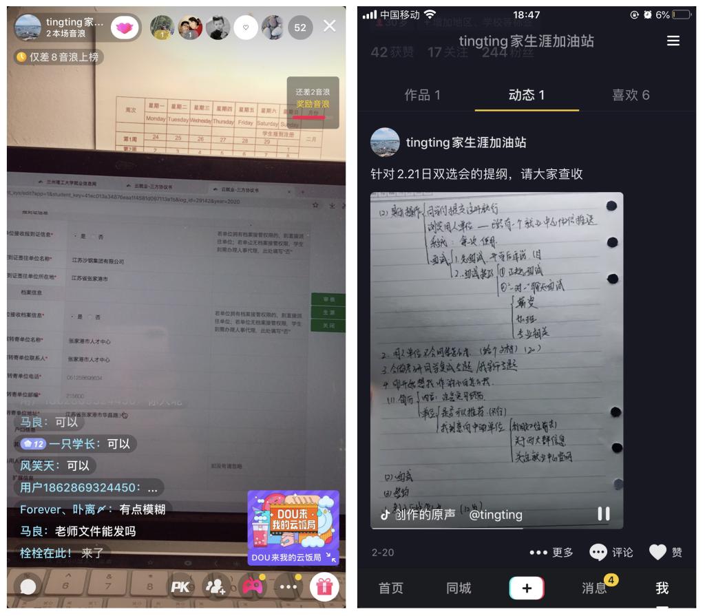 思想政治教育、管理服務(wù)是始終貫穿輔導(dǎo)員日常的工作。兼任思政課教學(xué)的劉舒婕老師在QQ課堂上帶領(lǐng)同學(xué)們一起感受疫情防控中展現(xiàn)出的中國力量、中國速度,讓同學(xué)們更加堅(jiān)定了“四個(gè)自信”。分管就業(yè)的楊文婷老師及時(shí)轉(zhuǎn)變工作思路,通過各種線上“隔空”方式在就業(yè)指導(dǎo)、職業(yè)規(guī)劃、考研復(fù)試等問題上盡全力給予畢業(yè)生幫扶和指導(dǎo),她利用抖音平臺開展不同主題的直播,“面對面”幫助同學(xué)們轉(zhuǎn)觀念、指導(dǎo)學(xué)生網(wǎng)簽、指導(dǎo)學(xué)生利用好就業(yè)中心網(wǎng)上招聘平臺、傳授網(wǎng)上面試技巧和等各類應(yīng)聘問題…,“楊老師生涯加油站”成了同學(xué)們心中的網(wǎng)紅。