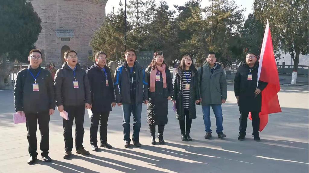 第二天上午,全體黨員來到寶塔山,這座古塔是革命圣地的標志和象征,像一把火炬照亮了中國革命的航程,見證了中國共產黨領導中國人民推翻三座大山的卓越功勛,成為人民心中一座不朽的豐碑。懷著崇敬的心情,在巍巍寶塔上的鮮紅的黨旗下,新入黨許繼祥同志莊嚴宣誓,全體黨員莊嚴地舉起右手,重溫入黨誓詞,支部王秀麗教授和馬天忠書記也對新入黨同志提出了要求和希望。通過合唱革命歌曲及朗誦詩歌等各種活動,大家心情很激動,深受激勵,表示要牢記黨的宗旨,永葆先進本色,繼承和發揚“延安精神”。