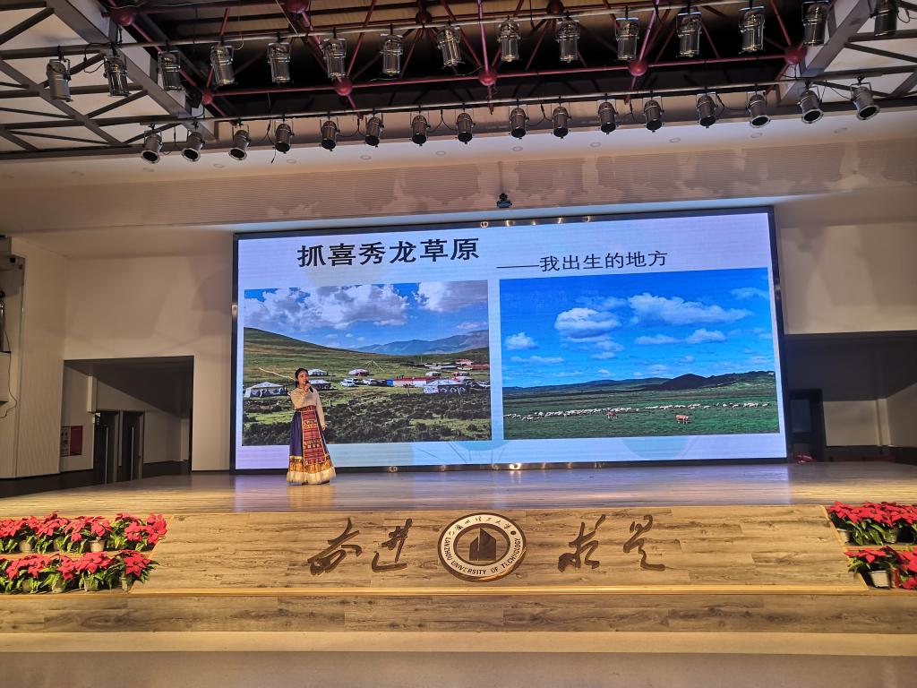 伴隨著《兒時》悠揚的旋律,比賽正式拉開序幕。經過前期的初賽、復賽,代表不同地方的8支隊伍脫穎而出,沖進決賽。決賽中,來自甘肅、江西、遼寧、四川、廣東等地的參賽選手分別按照順序上臺為大家展示自己家鄉的風土人情。其中“錦繡天祝”組的藏族選手還為大家展示了藏族特色舞蹈,讓觀眾近距離體驗了藏族舞蹈的優美和和藏族人民的奔放;“川妹子”組用當地巧妙的比喻給觀眾帶來了一個美食遍地的四川。其余選手也充分發揮了自身實力,利用家鄉的美食、文人、美景、趣事讓觀眾在了解各地的同時也學習了課堂以外的知識。最后,比賽評出一等獎一名、二等獎兩名及三等獎三名,由嘉賓頒發獎狀,至此,本次活動圓滿結束。