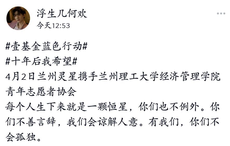 4月2日至7日,經濟管理學院青年志愿者協會全體成員于線上參加了凡靈星特殊兒童教育機構的“壹基金藍色行動”志愿活動。