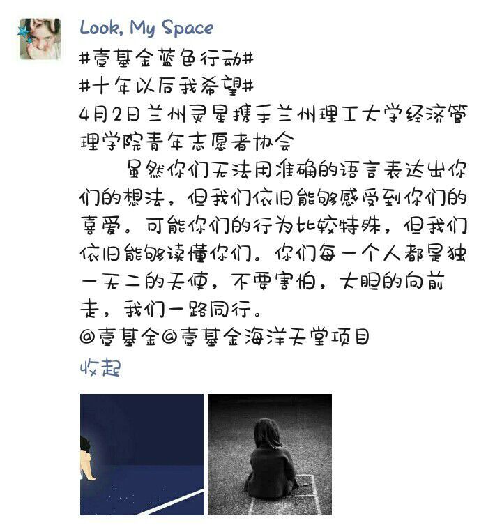 受疫情影響,志愿者雖然無法到實地與自閉癥兒童們親密接觸,但通過網絡平臺,志愿者們依舊能為自閉癥患者貢獻綿薄之力。志愿期間,志愿成員圍繞“讓礙走,讓愛來”的主題展開。一方面對線上活動進行了具體安排,另一方面通過微博、QQ空間、微信朋友圈等線上方式撰寫并轉載了各種精彩文章,呼吁著更多的人了解自閉癥兒童,關注自閉癥兒童。