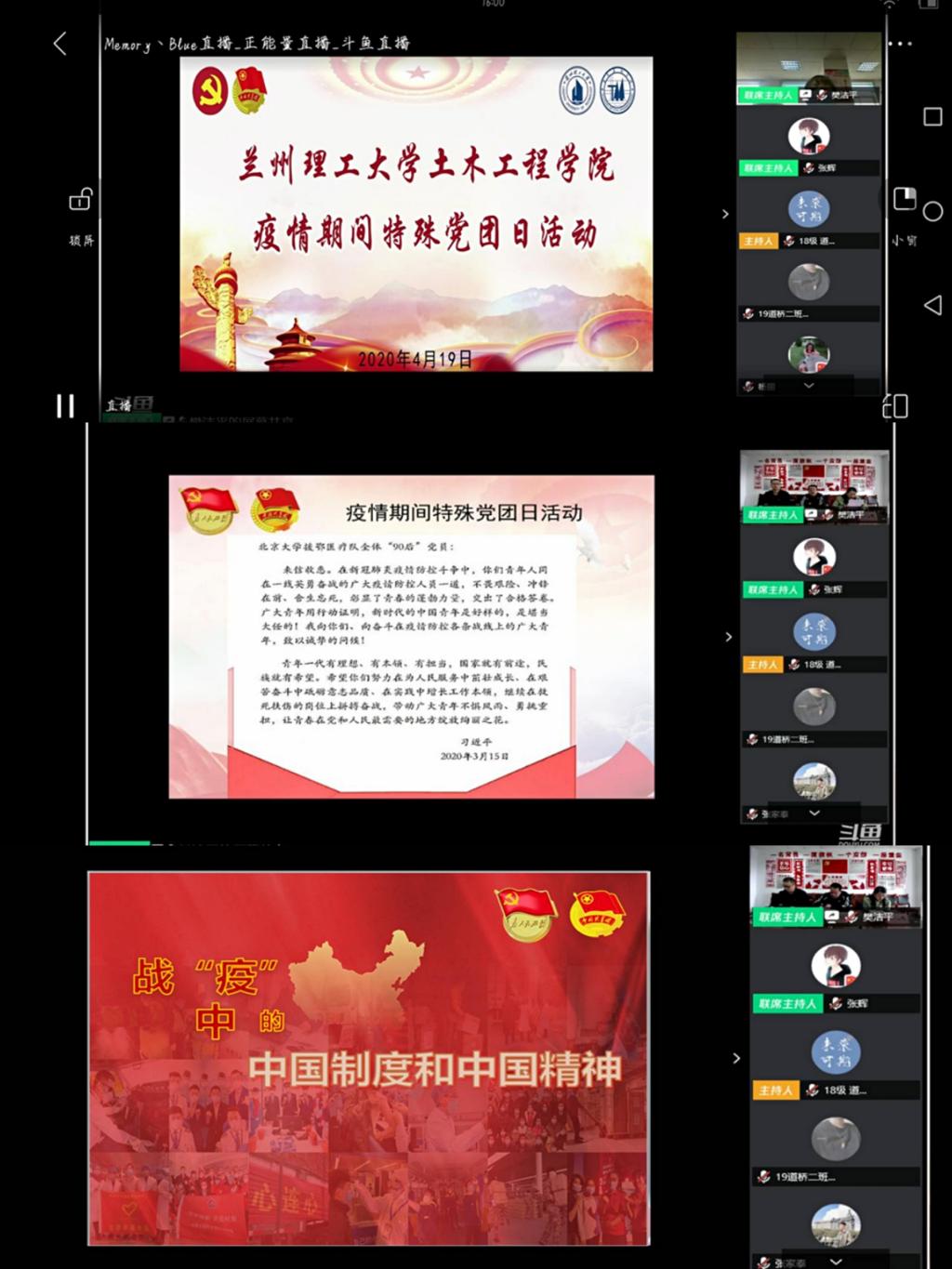 4月19日下午,土木工程學院開展了疫情期間“線上”主題黨日團日活動,學院黨委書記田治學及全體輔導員參加了活動,學院師生共計3000余人觀看了活動直播。
