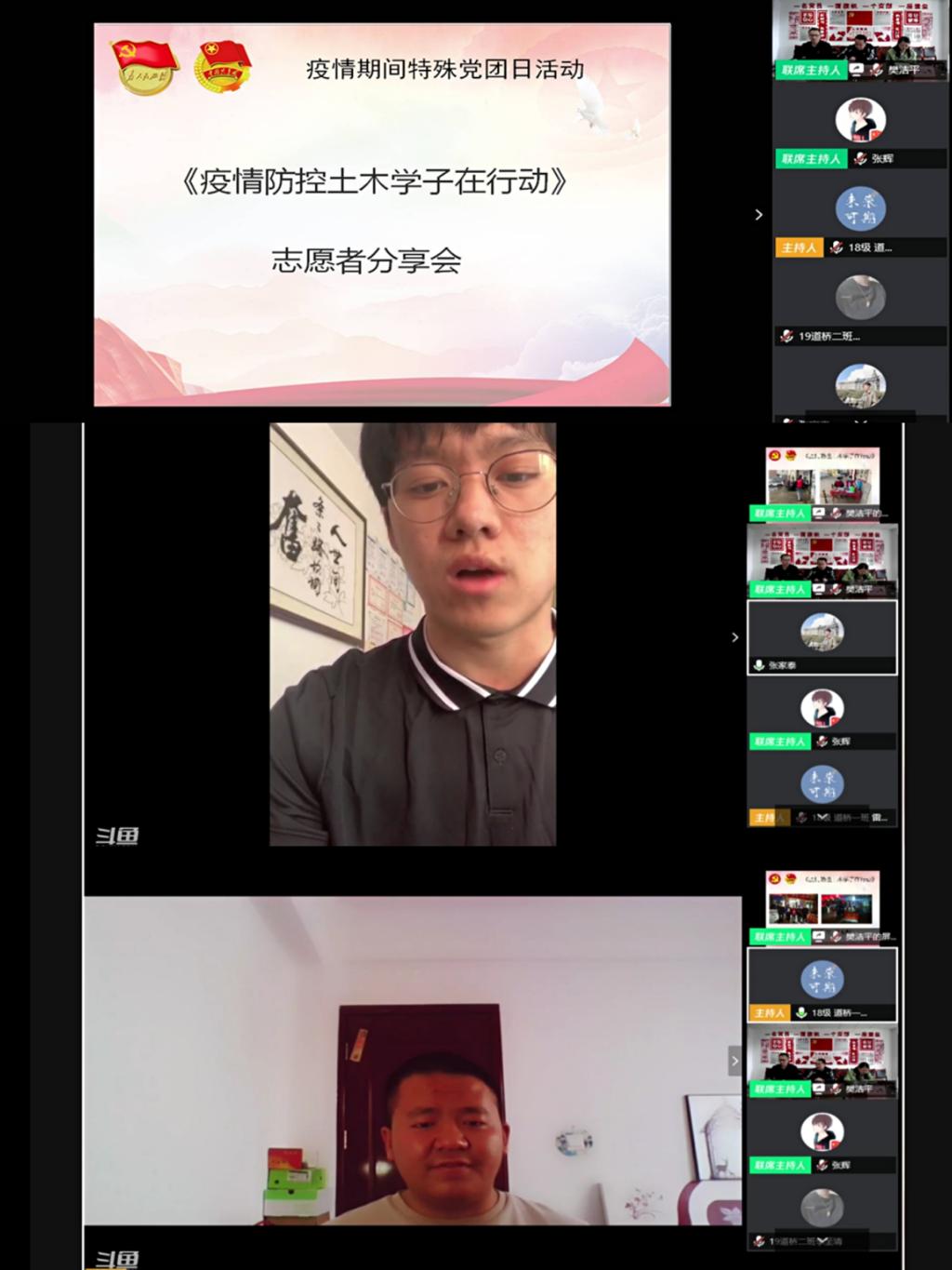 疫情期間,土木學院黨員、團員青年積極參與疫情防控各項工作,在《疫情防控土木學子在行動》志愿者分享會上,學院疫情防控志愿者代表楊麗、馬茂源、張家泰、雷峻懿、李至清5名同學先后做了交流發言。
