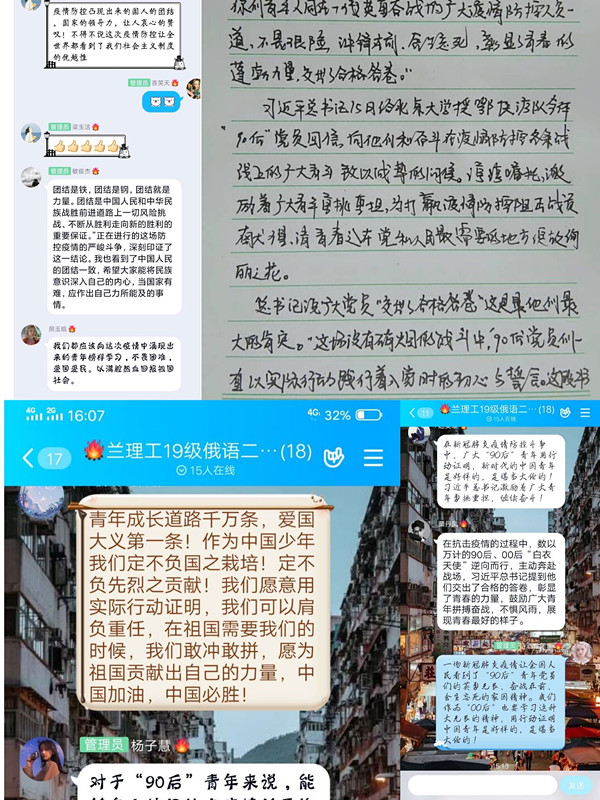3月15日,北京大學(xué)援鄂醫(yī)療隊(duì)收到了一封特殊的回信,信件的寄出者是中共中央總書(shū)記、國(guó)家主席、中央軍委主席習(xí)近平。這封寄給北京大學(xué)援鄂醫(yī)療隊(duì)全體“90后”黨員的回信,既是對(duì)北大援鄂醫(yī)療隊(duì)誠(chéng)摯的問(wèn)候,也是對(duì)奮戰(zhàn)在抗疫一線青年人的深切關(guān)懷,更是對(duì)廣大青年人有力的號(hào)召——廣大青年要勇于擔(dān)當(dāng),敢于拼搏,積極投身于疫情防控阻擊戰(zhàn),到黨和人民最需要的地方去。4月10日至16日,外國(guó)語(yǔ)學(xué)院全體青年團(tuán)員們以線上學(xué)習(xí)方式對(duì)習(xí)近平總書(shū)記的回信展開(kāi)了理論學(xué)習(xí),感觸頗深。