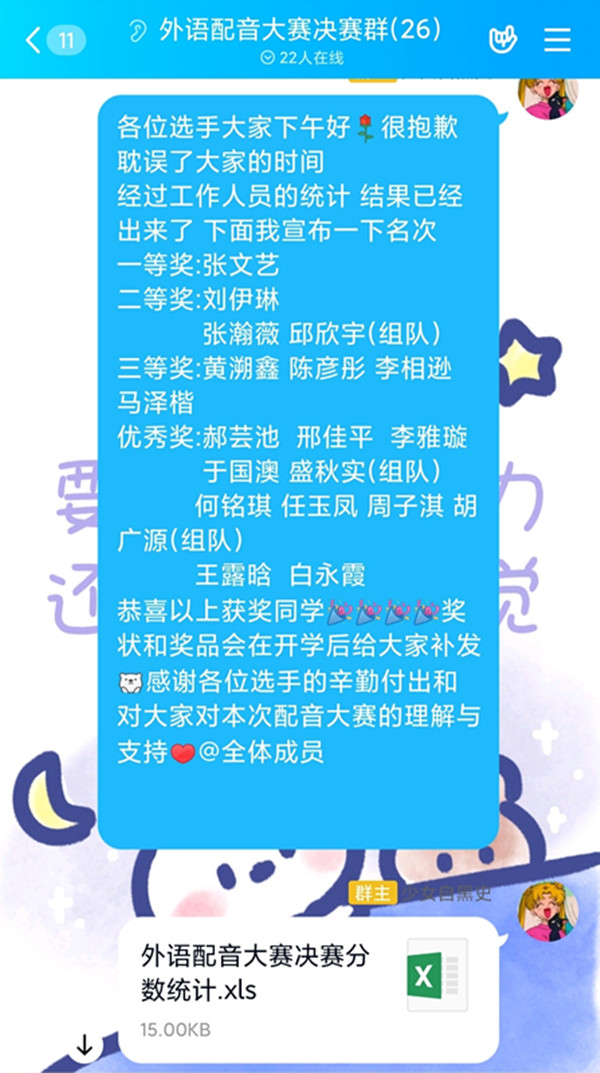 此次配音大賽分為初賽和決賽兩個階段,受疫情影響,本次配音大賽的初賽與決賽均采取線上形式開展。初賽分為英語專業場、日語場和非英語專業場三個場次,共有來自11個不同學院,不同專業的97名同學參加。選手們賽前積極認真準備,從網上尋找最適合自己的配音片段或選擇由主辦方提供的配音片段,參賽選手們將配音作品提交給工作人員,后由評委老師進行評選打分,工作人員及時在線上公布選手們的分數,保證了比賽的公平公正。經過激烈的角逐,共有14名選手進入決賽。決賽過程緊張激烈、選手們各個實力非凡。最后,來自外國語學院的張文藝同學,憑借其配音作品《艾瑪沃森演講》中良好的語音語調,充沛的情感奪得了本次配音大賽的一等獎。
