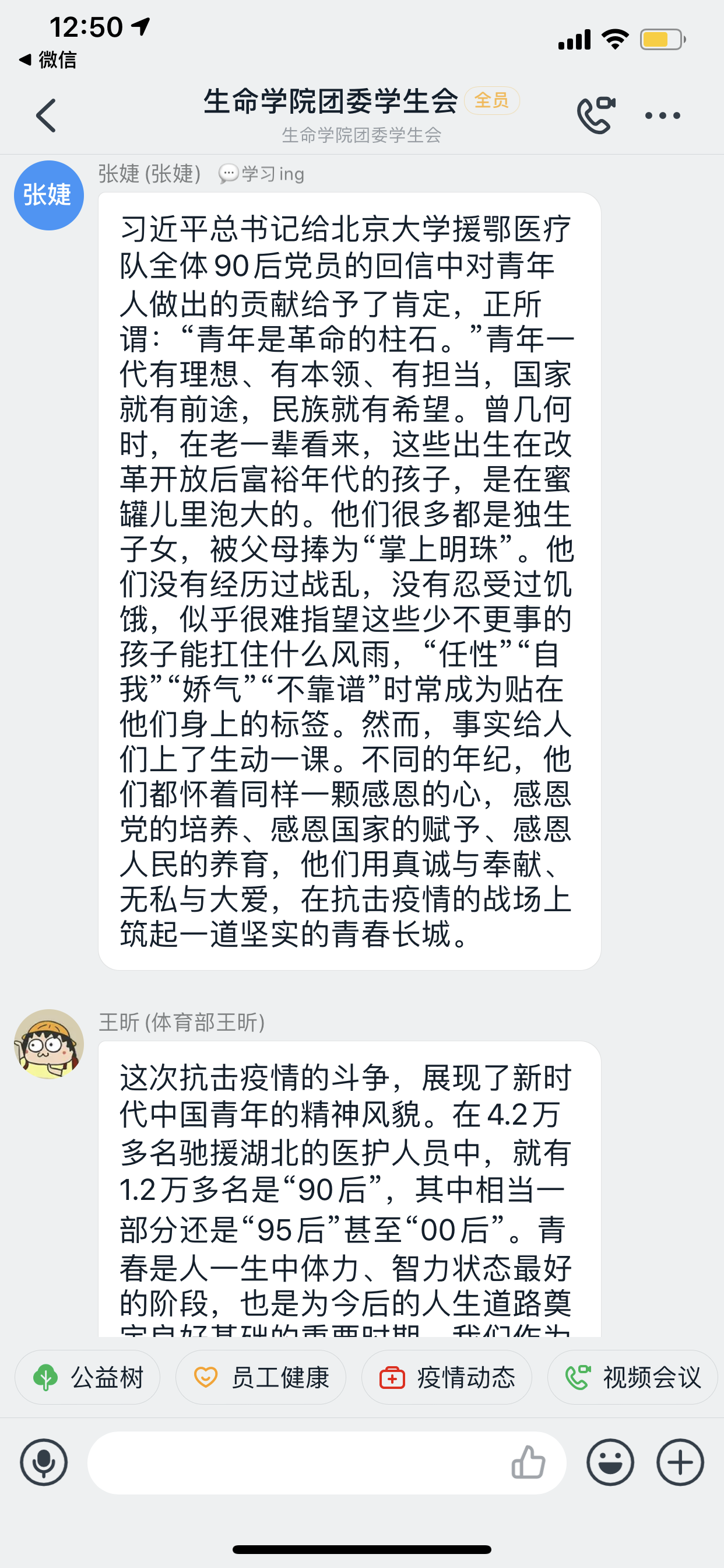 4月17日,生命學院組織兩委會學生通過釘釘平臺學習了《習近平總書記給北大援鄂醫療隊全體“90后”黨員重要回信》。