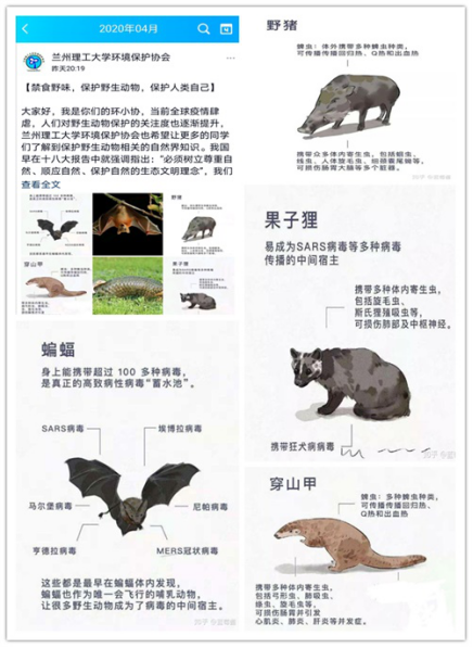 此次活動主要通過易班和環保協會QQ空間推送聯動進行,從4月6日開始,科普共進行九期,依次介紹野生動物中病毒攜帶者以及病毒中間宿主之間的關系、《中華人民共和國野生動物保護法》中大眾忽視的細節、3月3日“世界野生動植物日”的設立由來以及2013年至今以來的活動主題等內容,目前已推送兩期,通過科普我們了解到很多關于野生動物的知識,比如法律所保護的野生動物,是指珍貴、瀕危的陸生、水生野生動物和有重要生態、科學、社會價值的陸生野生動物。