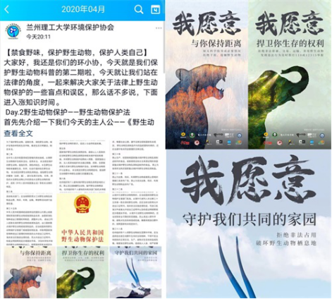 近日,蘭州理工大學環保協會開展 “禁食野味,保護野生動物,保護人類自己”知識與法科普活動。希望給更多的同學科普保護野生動物相關的自然界知識和法律常識,呼吁大家一同加入到禁食野味,保護野生動物的行列中來。