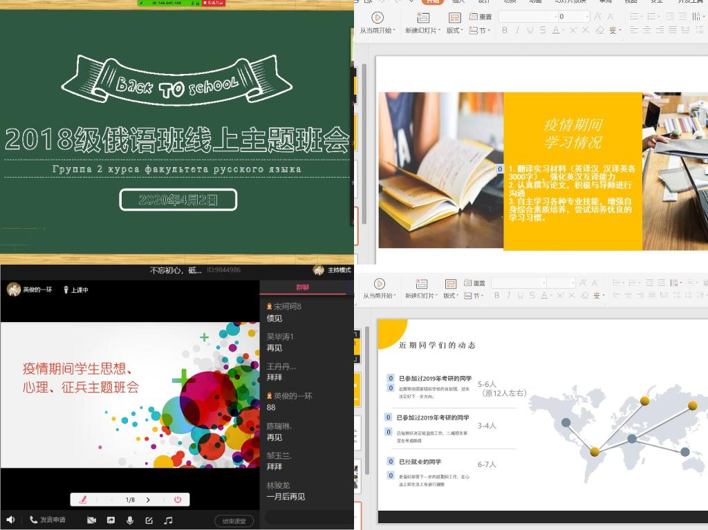 近日來,新型冠狀病毒肺炎疫情形勢依然嚴峻,防控工作仍是首位。為深入貫徹落實學院關于打贏疫情防控阻擊戰工作要求,加強學生思想政治教育,教育引導學生以高度的責任心和強烈的使命感增強抗擊疫情的信心,用實際行動助力疫情防控,清明假期前夕,外國語學院全體學生班主任利用釘釘、騰訊會議室、微信等網絡平臺,面向全院21個班級的五百余名學生,召開了有關疫情期間學生的思想動態,心理問題,學習,就業,論文,征兵宣傳等特殊時期線上主題班會。