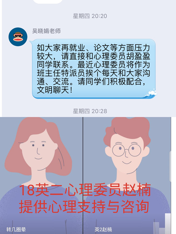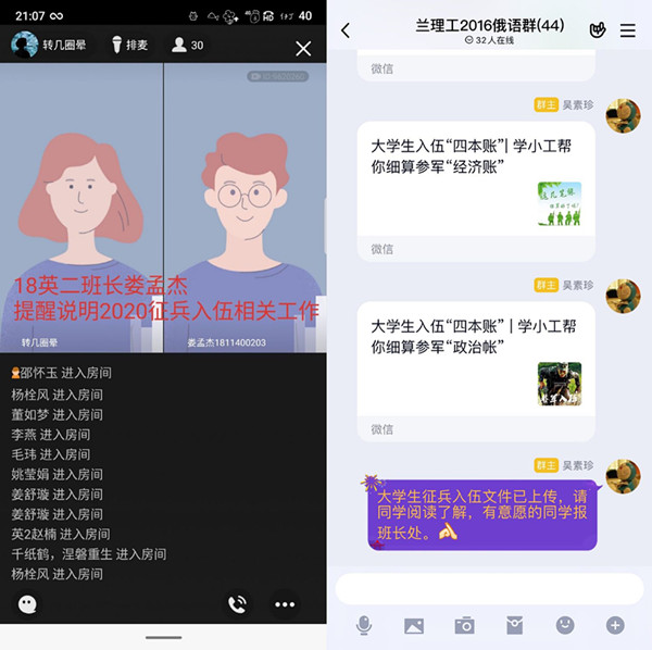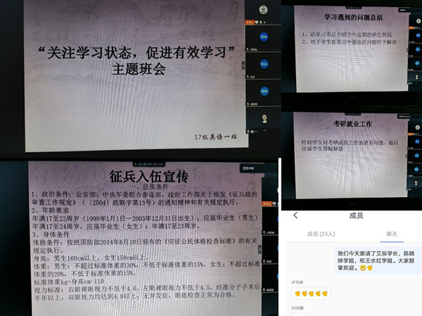 班會上,各班班主任詳細了解了班級同學在疫情期間的情況,傳達了當前疫情形勢,強調了疫情期間線上教學的紀律,介紹了疫情期間心理援助的相關途徑以及參軍入伍相關政策,鼓勵大學生積極參軍入伍,保家衛國添榮光,同時畢業班班主任鼓勵畢業生以積極的心態去面對疫情帶來的變化,積極參與空中宣講會、線上招聘,在家合理的安排好自己的學習、生活和體育鍛煉、按部就班進行論文寫作。