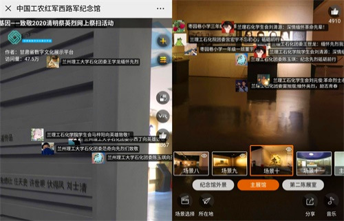 活動中,團(tuán)學(xué)干部登陸“甘肅青年”微信公眾號“清明追思,祭奠英烈”網(wǎng)上祭英烈活動頁面,參與“追尋紅色足跡·傳承紅色墓園”—甘肅高臺中國工農(nóng)紅軍西路軍紀(jì)念館VR全景參觀、緬懷英烈獻(xiàn)花、祭奠英烈祭掃等活動模塊。中國工農(nóng)紅軍西路軍紀(jì)念館VR展館以多角度、多方式還原紀(jì)念館外景、主展館、第二陳展館等真實場景,圖音、圖文并茂展示了場館內(nèi)外20多處場景,增強(qiáng)了同學(xué)們網(wǎng)上祭掃的實景體驗。