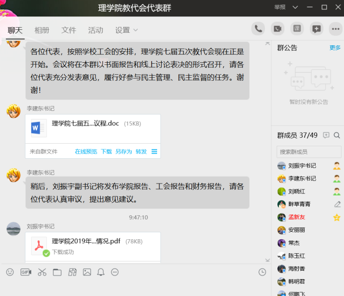 2020年3月24日下午,理學院通過書面報告和線上交流的形式召開了2020年二級單位教職工代表大會。會議以習近平新時代中國特色社會主義思想為指導,深入學習貫徹黨的十九大和中國工會十七大精神。審議通過了學院院長歐志英代表學院所做的2019年學院行政工作報告及2020年工作計劃,學院工會主席劉振宇所做的工會工作報告,學院財務工作報告。理學院所有教代會代表參會。