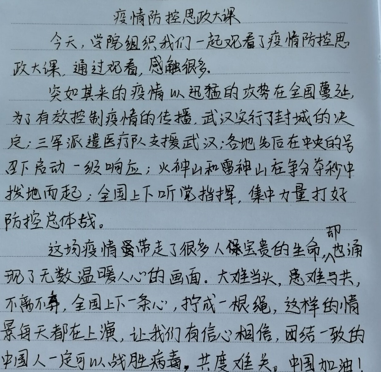觀看完課程直播后,輔導員老師積極組織學生進行在線交流討論,暢談自己對于戰“疫”的思考與感悟,以及這堂思政大課的體會與理解。在討論中,同學們群情激昂,都積極撰寫了觀后感并提交給學院,主動與其他同學分享。