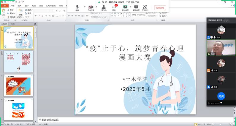 本次活動(dòng)共計(jì)收到心理漫畫作品81件、心理短視頻36件,本著公平公正的原則,5月17日晚,學(xué)院團(tuán)委樊潔平老師、院易班工作站楊金銀老師及學(xué)院心理輔導(dǎo)站全體學(xué)生進(jìn)行了線上評審,最終評選出心理漫畫大賽一等獎(jiǎng)2名、二等獎(jiǎng)5名、三等獎(jiǎng)8名;心理短視頻大賽一等獎(jiǎng)2名,二等獎(jiǎng)3名,三等獎(jiǎng)4名。