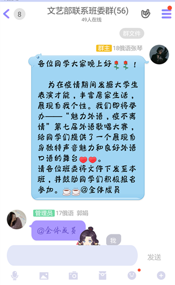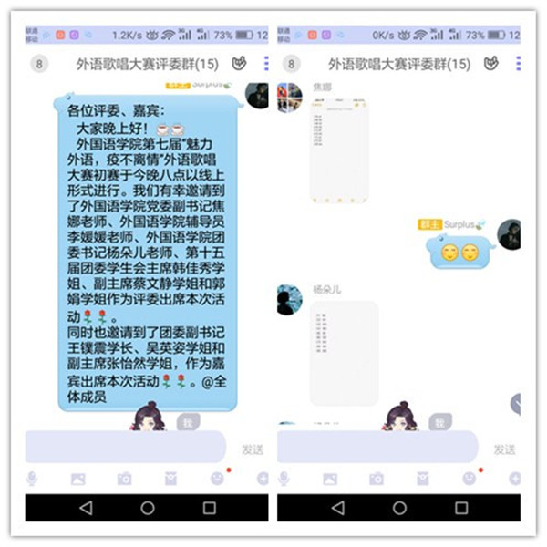 2020年5月9日—12日,由外國語學院團委學生會主辦的“魅力外語,疫不離情”第七屆外語歌唱大賽初賽以線上形式舉行。學院黨委副書記焦娜、輔導員李媛媛、團委書記楊朵兒及團委學生會干部參加活動。