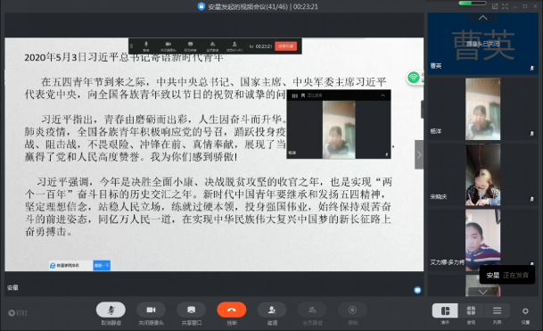 2020年5月12日晚,理學院團委開展主題為“奮進正當時,青春勇擔當”的學生干部主題團課,深入學習習近平總書記五四前后寄語精神并安排部署相關工作,團委書記安星老師主持,理學院全體學生干部參加。