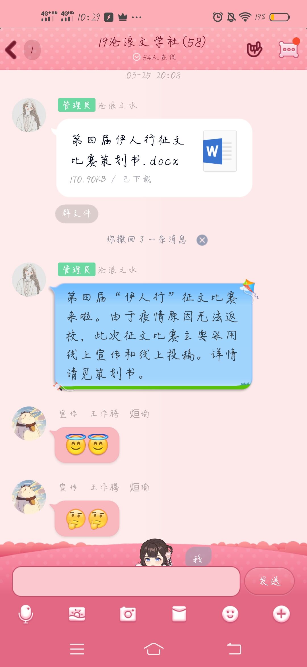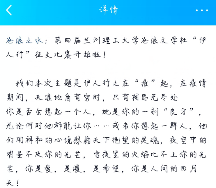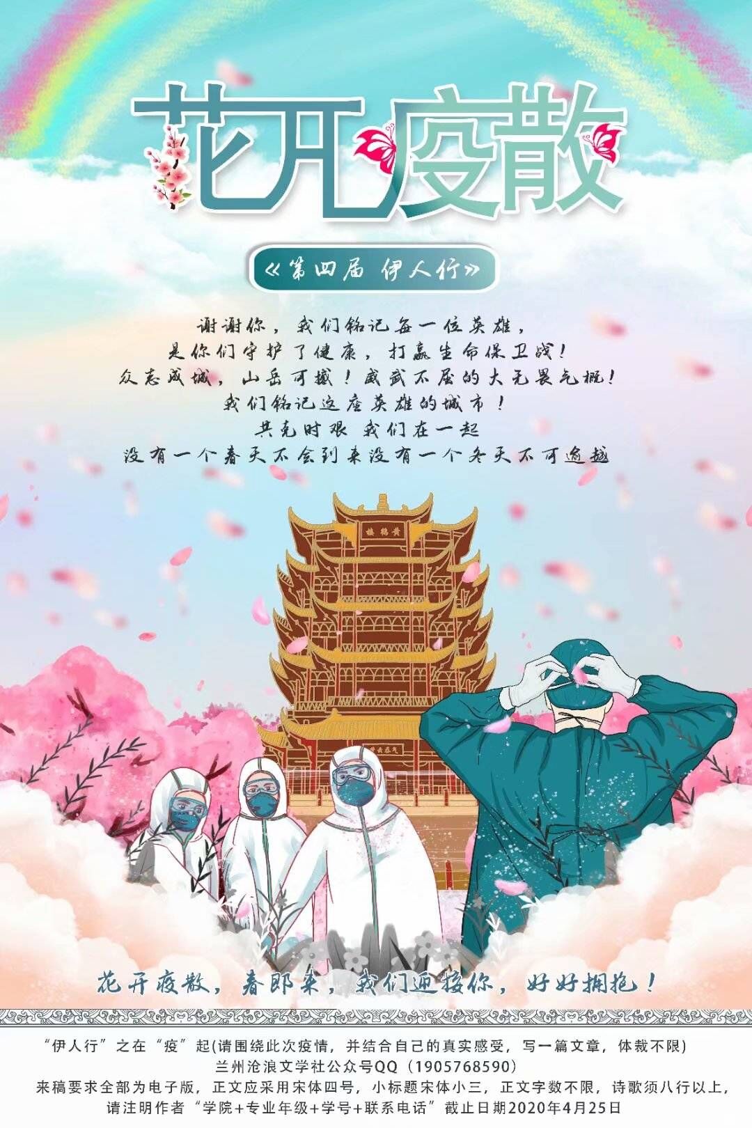 為響應“全民爭做疫情防控的踐行者和宣傳者”的國家號召,促進全校文學愛好者之間的交流,經濟管理學院滄浪文學社面向全校學生舉行第四屆“伊人行”征文比賽。4月1日活動正式開始。特殊時期,采取特殊形式進行宣傳,為期二十五天征稿,由社團成員進行匯編整合。