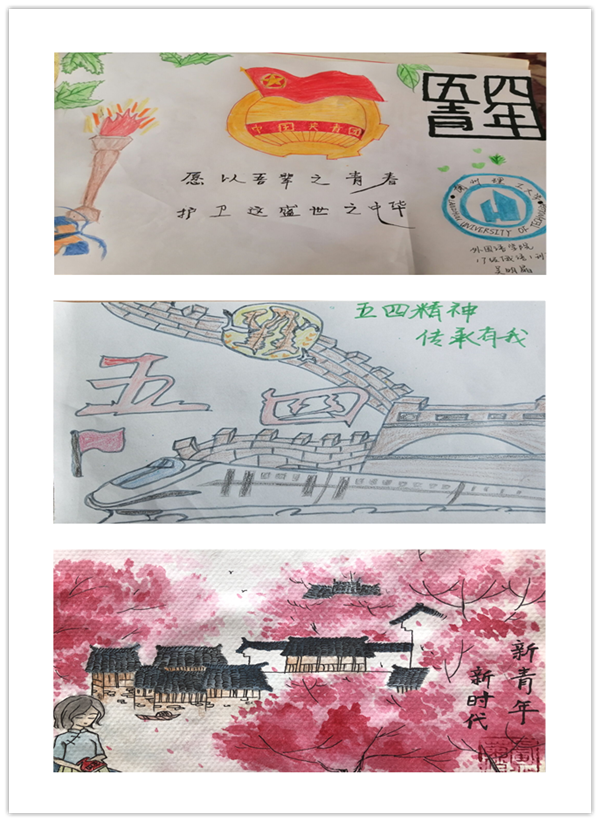 彩色的畫作描繪出同學們對青春的寄愿,傳遞五四朝氣蓬勃,青春向上的精神;蒼勁有力的書法展現了同學們風華正茂,富有活力的精神風貌;在簡短的視頻當中,也表達了同學們對祖國和五四的祝福,表現出誠摯的愛國心和奉獻精神。