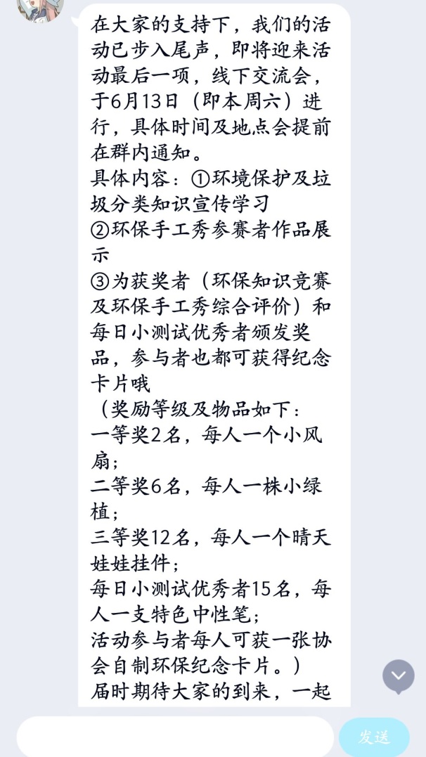 活動中,同學們著力踐行綠色發展理念,志愿者線上設置了環境保護知識搶答和問卷調查環節,線下設置了用廢舊物制作創意精美手工作品,以在線匿名投票的方式選出了優秀的手工作品。活動末,同學們講解了自制手工品的內涵和意蘊,志愿者為優秀的手工作品頒發了小禮品。