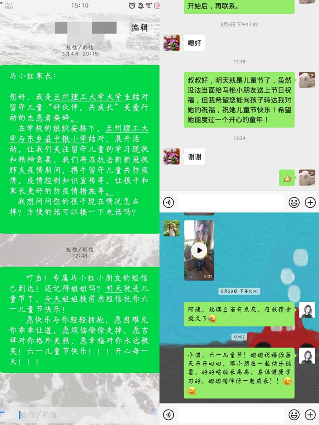 為積極響應國家對留守兒童的關注,表達大學生渴望回饋社會的心情以及對祖國下一代健康成長的期望,蘭州理工大學經濟管理學院優秀學生志愿者自3月初以來,通過微信、QQ、電話、短信“一對一”結對輔導、答疑等形式與東鄉族自治縣留守兒童成功對接,開啟了互幫互助、線上輔導模式,有針對性地幫助孩子們制定假期學習計劃,做好特殊時期留守兒童的感情陪伴。