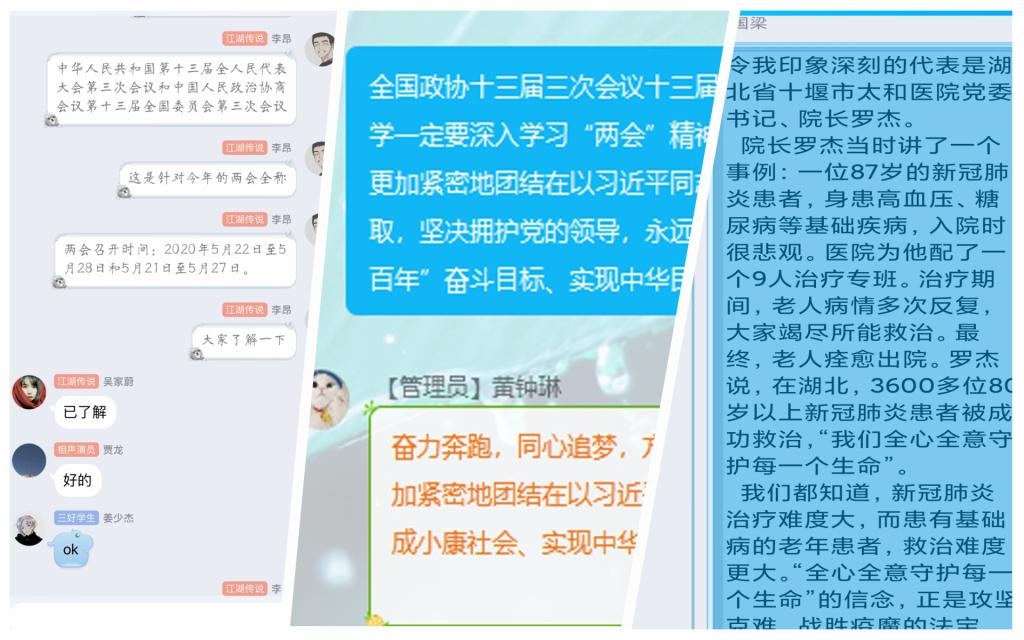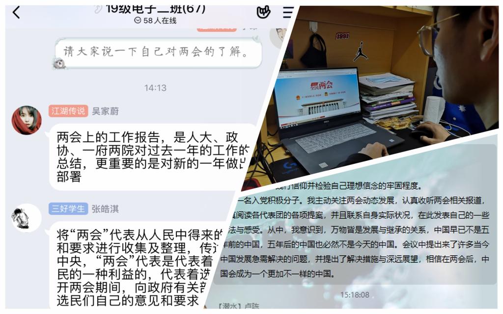 學院全體師生熱切關注全國兩會議程,認真學習領會政府工作報告。2016級各畢業(yè)班通過召開線上主題班會,重點學習了政府工作報告中“加大宏觀政策實施力度,著力穩(wěn)企業(yè)保就業(yè)”的就業(yè)優(yōu)先政策,號召畢業(yè)生將所學專業(yè)、個人規(guī)劃與時代發(fā)展、國家需求結合起來,積極就業(yè),在放飛青春夢的同時實現(xiàn)中國夢。2018級自動化1班以主題團日活動的形式開展了集體學習和法治教育,對十三屆全國人大三次會議表決通過的《中華人民共和國民法典》進行了重點介紹,普及了法律知識,提高了守法意識。2020年是決勝全面建成小康社會、決戰(zhàn)脫貧攻堅之年,全國兩會肩負著謀劃部署今年經(jīng)濟社會發(fā)展目標任務的重要使命,學院2019級研究生圍繞兩會中彰顯的“以人民為中心”的發(fā)展思想展開了集體學習和主題討論。