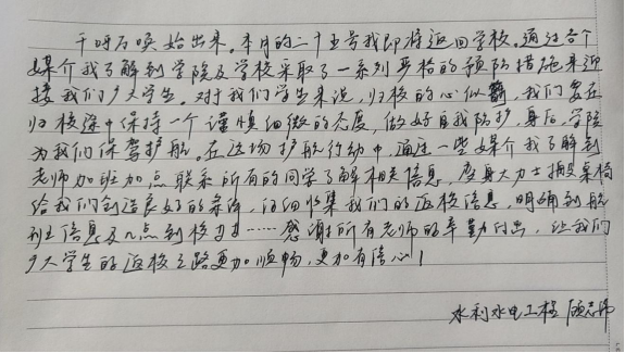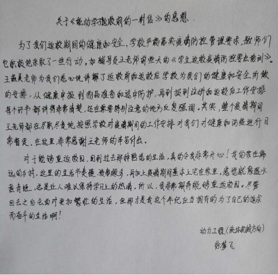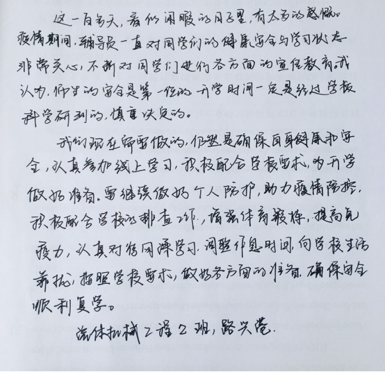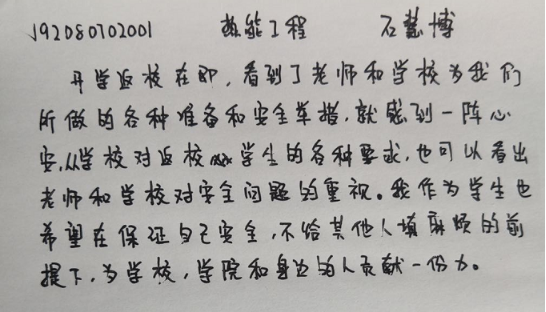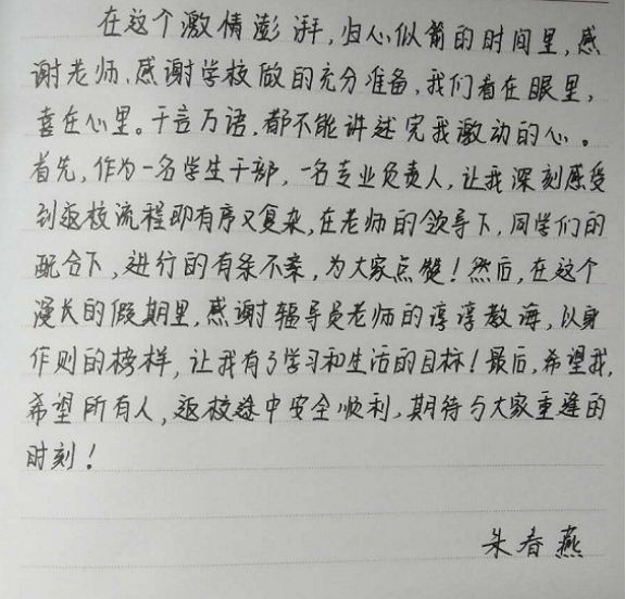 會議氣氛輕松愉快,會議中大家踴躍發言,每個人都談了一些關于自己在寒假生活的感受和體會,對于即將返校的消息所產生的無比激動的心情,以及返校之后的打算;表示通過這次超長的假期使我們更加懂得珍惜校園時光,并且對于學校、學院、輔導員為我們安全返校的辛勤付出表示衷心的感謝。最后,期待不久的將來我們相聚在美好的校園。