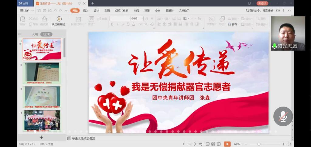 5月12日下午,第20屆“中國青年五四獎章”獲得者、共青團蘭州市委副書記、甘肅省無償捐獻遺體器官志愿服務隊隊長張森以《生命的延續—我是一名器官捐獻志愿者》為主題,講述了自己二十年如一日,從事無償捐獻遺體器官的感人事跡,他認為志愿服務“貴在堅持、點滴做起、創造價值”,希望同學們提高對遺體和器官捐獻重要意義的認識,廣泛宣傳相關法律法規,共同推進遺體器官捐獻事業的健康發展,讓生命在大愛中延續。