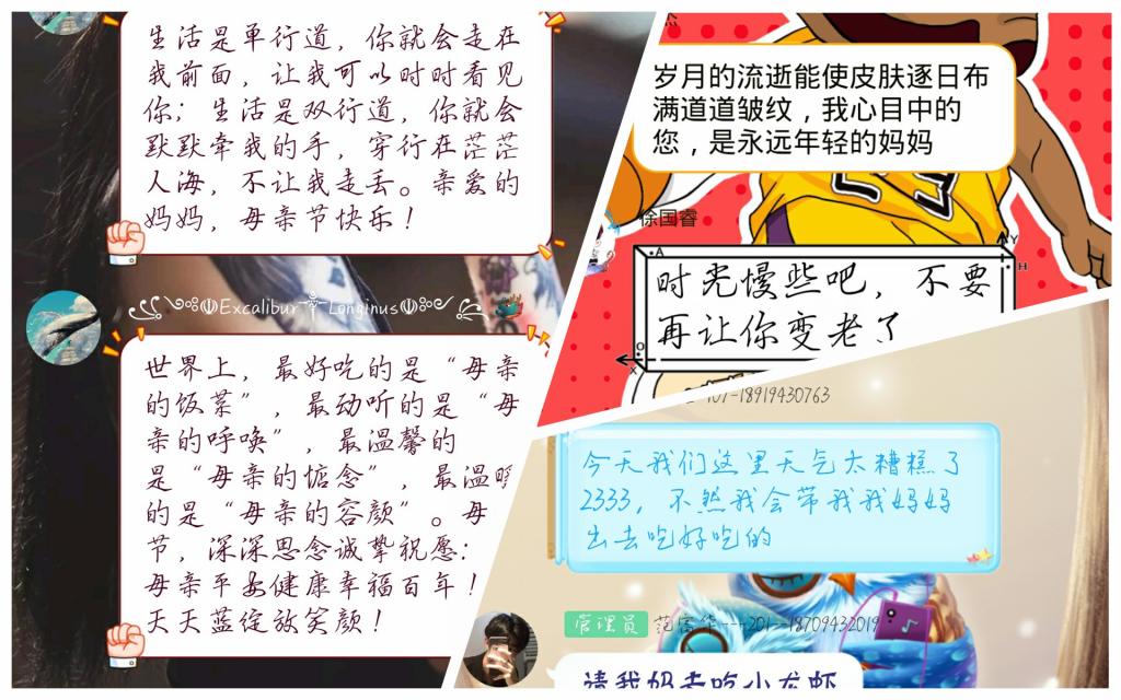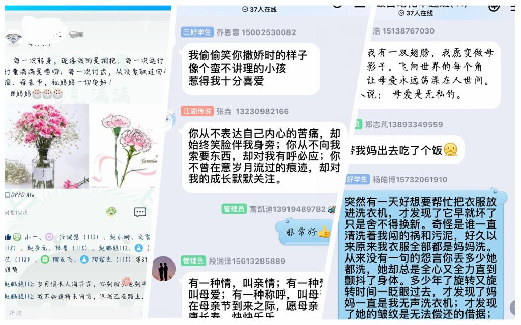 各班級通過主題班會開展“戰(zhàn)疫中的偉大母愛”線上故事分享活動,分享已身為人母的抗疫巾幗英雄的事跡,學習她們無私奉獻的精神,同學們紛紛通過朋友圈為母親送上節(jié)日的祝福。學院號召學生在節(jié)日當天主動承擔家務勞動,為父母做一道菜,整理房間以及一系列力所能及的事,向母親表達多年養(yǎng)育的感恩之情。