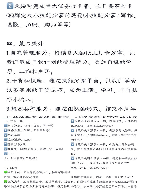 活動一經推出就受到了外國語學院及其他學院同學的積極響應。活動中,本院和其他學院同學一同積極參與,充分利用在線學習平臺PC端和移動端,在分組QQ群進行每日早睡早起、明日計劃等打卡任務。各組監督員每日記錄本組成員的完成情況并在活動最后進行分數匯總。活動采取線上測試答題、分享心得體會、暢談學習收獲、制定行動計劃等多種方式,加強疫情防護、專業課程、第二課堂的深度學習,不斷優化知識、能力結構,全院上下形成重視學習、樂于學習、善于學習的濃厚氛圍。