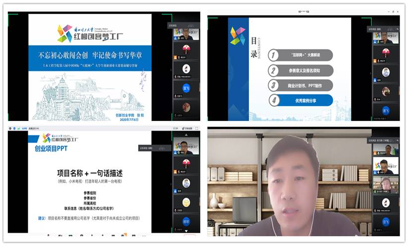 活動依托騰訊會議、網(wǎng)絡(luò)直播平臺開展。徐陽老師做了題為“不忘初心敢闖會創(chuàng),牢記使命書寫華章”的主題報告。報告從“互聯(lián)網(wǎng)+”大賽的由來、學(xué)校互聯(lián)網(wǎng)+大賽所取得的成績、參加“互聯(lián)網(wǎng)+”大賽意義、商業(yè)計劃書撰寫及答辯PPT制作、優(yōu)秀案例分享等若干模塊,對“互聯(lián)網(wǎng)+”大賽進行了全面解讀。