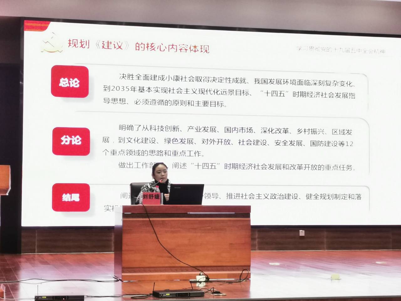 報告會上,劉老師帶領同學們從全會的主要內容、全面建成小康社會的決定性成就、“十四五”規劃《建議》的起草過程、“十四五”規劃《建議》的內容亮點等方面對十九屆五中全會精神進行了宣講。劉老師結合共青團工作實際,對同學們提出了要求,她希望團干部、廣大團員青年堅定四個自信,認真學習,提高本領,增強能力,將個人理想融入國家發展偉業,積極投入到全面建設社會主義現代化國家新征程,在大有可為的“十四五”時期建功立業。