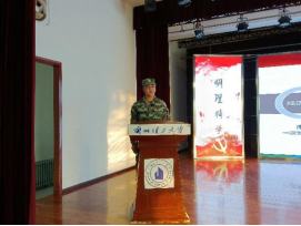 接著,唐洪川主任為同學(xué)們做了國(guó)防教育專題報(bào)告,從我國(guó)周邊環(huán)境到大學(xué)生征兵工作流程,進(jìn)行了詳細(xì)地講解,深刻闡釋了國(guó)防建設(shè)的重要性。他強(qiáng)調(diào):“好兒女,當(dāng)兵報(bào)國(guó);大學(xué)生,軍營(yíng)建功!”唐主任在本次講座中以激情澎湃又不失幽默的語(yǔ)言,深入淺出的講解,使會(huì)場(chǎng)的同學(xué)不僅對(duì)國(guó)防有了深刻的理解,更拓展了視野,增長(zhǎng)了見識(shí),極大的激發(fā)了同學(xué)們的愛國(guó)熱情和立志成材報(bào)效祖國(guó)的決心。最后安老師總結(jié)發(fā)言并鼓勵(lì)大家:“當(dāng)代大學(xué)生應(yīng)該勇于吃苦,敢于吃苦,我相信,軍旗飄蕩的地方也將是你們?nèi)松晒Φ牡胤健!?/p>