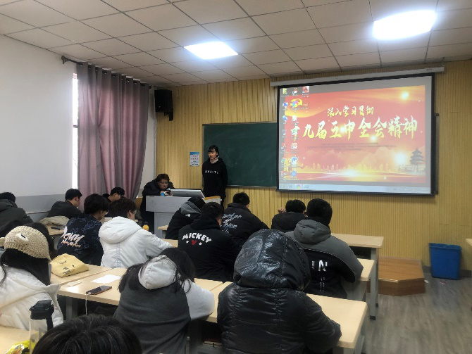 活動中,由各班團支書進行本次活動宣講,觀看十九屆五中全會相關視頻,學習十九屆五中全會公報內容。各班委組織同學們進行熱烈的討論,同學們紛紛表達自己的學習體會。最后,由團支書對本次活動進行總結,作為作為新時代大學生,我們要認真學習并深刻領會黨的十九屆五中全會精神,在學懂,弄通,做實上下功夫。堅定共產主義理想信念,以習近平新時代中國特色社會主義思想為指導,不斷增強“四個意識”,堅定“四個自信”,做到“兩個維護”。