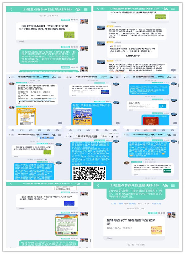 學院通過針對性“一對一”推薦和學院“外國語學院2021屆畢業生”群為畢業生每日分享和推薦就業招聘信息。通過“全國高校畢業班輔導員就業工作平臺”及時向畢業班學生分享各類就業政策和就業能力提升培訓課程,不斷提升學生的就業能力和自己的素質,多措并舉,力促重點群里未就業畢業生就業。