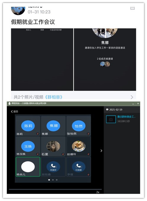 學院按照學校安排對本學院重點群體未就業畢業生進行了線上家訪,詳細了解了畢業生家庭的具體情況、求職意向等。向畢業生家長反饋了畢業生同學在校期間的學習、生活及面臨的就業形勢等情況,詳細詢問畢業生未就業的原因、困難及進一步的求職計劃,重點宣傳了相關就業政策和就業幫扶舉措,宣傳《蘭州理工大學2021年寒假期間學生就業工作安排》、招聘咨詢、線上就業指導、咨詢熱線等服務。