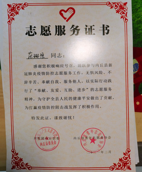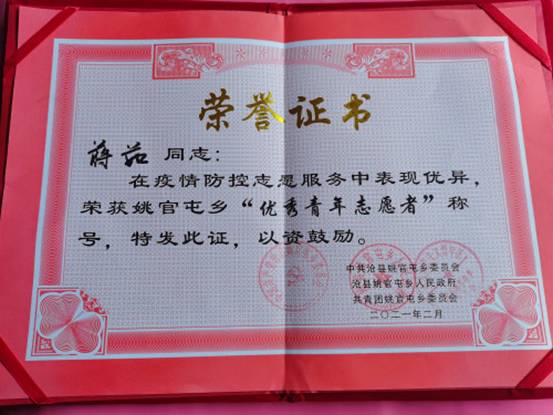 2018級油氣儲運工程1班團支書蔣茹家住河北省滄州市滄縣姚官屯鄉(xiāng)竇店村,寒假返鄉(xiāng)第三天就積極加入當(dāng)?shù)刂驹阜?wù)隊,在村口卡點值班,在河北地區(qū)疫情尚未平穩(wěn)時檢查進出人員的行程碼,及時向上級組織報備,受到當(dāng)?shù)攸h團組織和人民政府的獎勵。她說“作為團支部書記,希望用自己力所能及的貢獻影響支部團員積極參與各類志愿服務(wù)工作,帶領(lǐng)更多同學(xué)真正做到‘黨有號召,團有行動’”