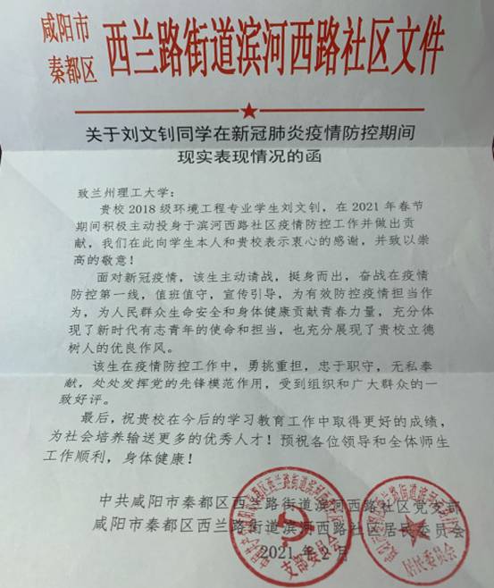 2018級環(huán)境工程1班劉文釗同學(xué)去年寒假在疫情最吃勁的階段以青年團員的身份在陜西省咸陽市國一醫(yī)療器械有限公司從事志愿服務(wù),將彼時急需的醫(yī)療物資運輸及送遞到陜西省咸陽市禮泉縣婦幼保健醫(yī)院。今年寒假,他以一名預(yù)備黨員的身份再次加入志愿者行列,在當(dāng)?shù)匾咔橄鄬ζ椒€(wěn)的情況下在社區(qū)門口值班,登記外地返鄉(xiāng)人員信息并查驗驗健康碼,受到社區(qū)黨組織表揚。談及連續(xù)兩年的志愿服務(wù)經(jīng)歷,他表示“一年多以來,疫情形勢、工作內(nèi)容、自己的身份雖然都有一些變化,但是在不同的志愿服務(wù)的過程中深刻體會到黨帶領(lǐng)全國人民在防控工作中展現(xiàn)出來的領(lǐng)導(dǎo)力和執(zhí)行力,更加明確了一名黨員身上肩負(fù)的責(zé)任,為自己是一名光榮的共產(chǎn)黨員而自豪。”
