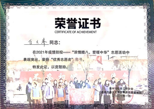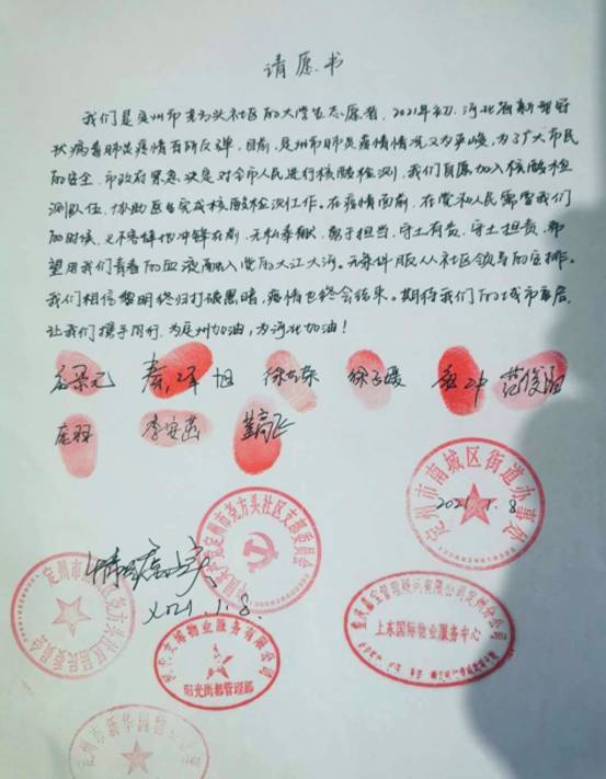 2019級過控卓越班團員龐沖家住疫情情況較為嚴(yán)峻的河北省定州市,在放假回家后,他和社區(qū)其他8名志愿者一起寫下請愿書,按上紅手印,表達了參與志愿服務(wù)配合市政府開展核酸檢測工作的信心和決心,在100個小時左右的志愿服務(wù)中,他穿起防護服參與協(xié)助進行核酸檢測,并錄入相關(guān)信息,為疫情平穩(wěn)貢獻了自己的力量。他表示“盡管這個假期的志愿服務(wù)經(jīng)歷已經(jīng)結(jié)束,但是‘奉獻、友愛、互助、進步 ’的志愿精神將伴隨我一生,鞭策我努力為社會做出自己的貢獻”。