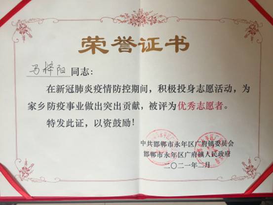 截止2月28日,家住河北省邯鄲市永年區(qū)廣府鎮(zhèn)北馬莊村的2018級過控卓越班團員馬梓陽已經(jīng)連續(xù)參與志愿服務(wù)40余天240多小時了,在剛放假返回家鄉(xiāng)時,疫情形勢尚不穩(wěn)定,他協(xié)助參與全員核酸檢測信息登記及錄入 和廣府鎮(zhèn)疫情防控暨全民核酸檢測工作培訓(xùn)會,協(xié)助村委會以及村黨支部完成各項信息統(tǒng)計,并和其他志愿者共同下戶至全村幫助2300余人申領(lǐng)電子健康卡。在臨近春節(jié)疫情穩(wěn)定后,他協(xié)助黨組織向廣大群眾宣傳邯鄲市禁燃禁放的通知,耐心向群眾解釋開展各項工作的必要性。忙碌了幾乎整個假期的他說,“瑣碎的工作讓我深刻理解到中國共產(chǎn)黨是全心全意為人民服務(wù)的,我渴望成為為人民服務(wù)的一份子,將青春和熱血揮灑在黨和國家的號召下,留下自己的一點力量和貢獻。”
