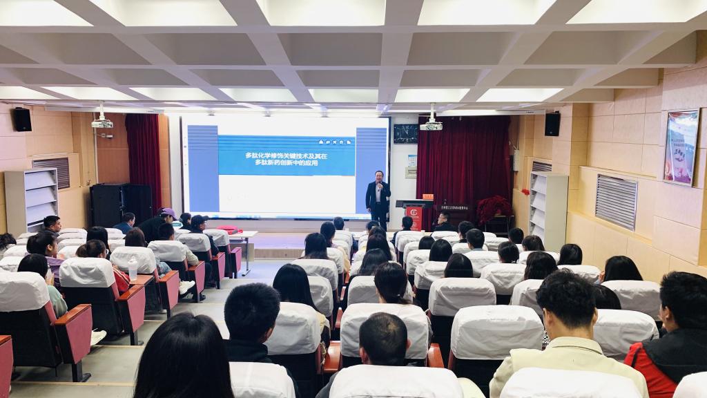 4月10日下午,應蘭州理工大學生命科學與工程學院邀請,蘭州積石藥業一行做客蘭州理工大學,董事長馬亞平博士為生命科學與工程學院師生作了題為“多肽修飾關鍵技術及其在多肽新藥創制中的應用”的報告。蘭州積石藥業人力總監、科研總監、項目總監、生命學院黨政班子及部分教師、研究生參加此次報告,報告會由蘭州理工大學生命科學與工程學院副院長楊明俊主持。