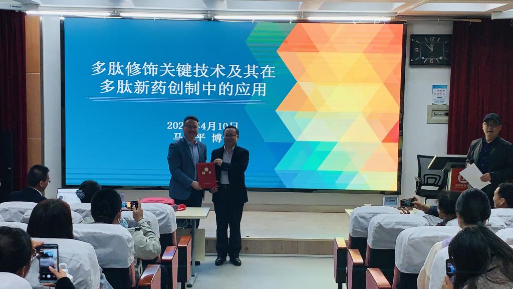 院長伍國強向馬亞平博士頒發蘭州理工大學生命學院兼職導師聘書。馬亞平博士介紹了多肽在醫藥方面的應用和多肽藥物的特點、經過化學修飾已上市的多肽藥物和在研多肽藥物的部分情況,并對多肽藥物未來發展的熱點進行了預測和總結。馬亞平博士提出多肽藥物的發展現狀轉型:即短效到長效,注射劑到口服,以及多肽藥物修飾的發展現狀轉型:從天然產物到簡單修飾再到復雜修飾。